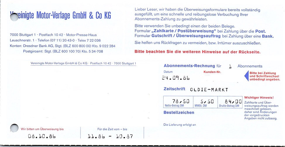 Abonnementrechnung aus dem Jahr 1986. Neben der Adresse ist hier die Kundennummer zu entfernen.