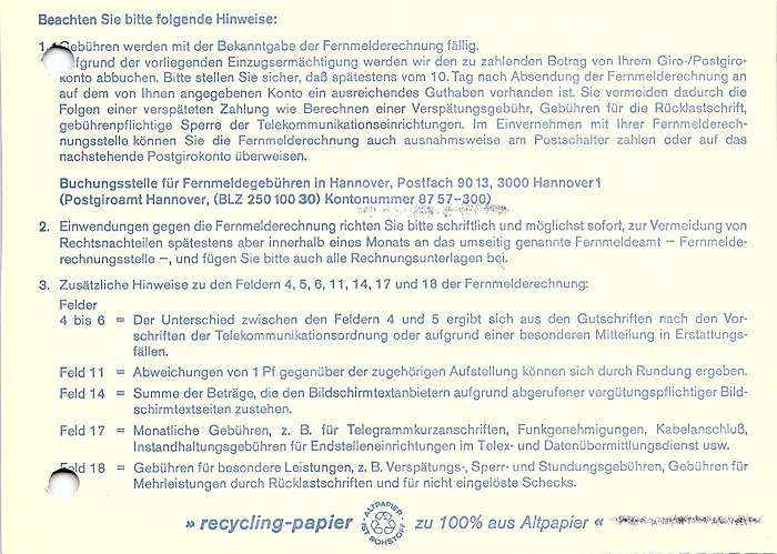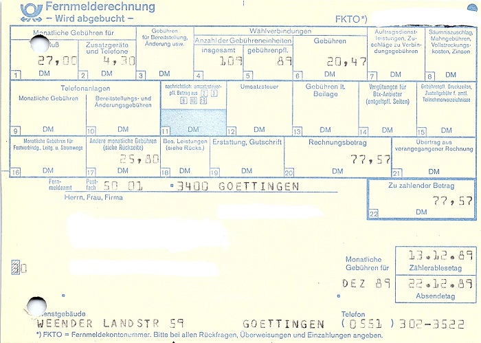 Fernmelderechnung aus dem Jahr 1989. Hier ist die Adresse sowie die Fernmeldekontonummer zu entfernen.