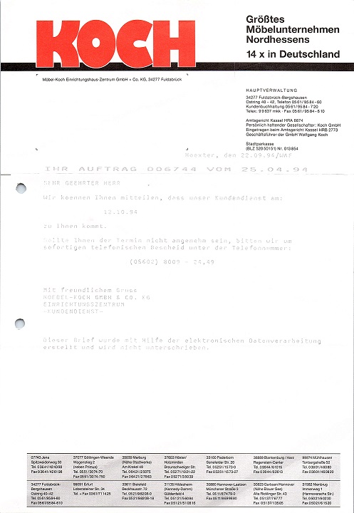 Beispiel für einen Brief, der im Nadeldruck erstellt wurde. Der Drucker druckte ziemlich schwach, so dass die Anonymisierung mit Tipp-Ex realisiert werden konnte.