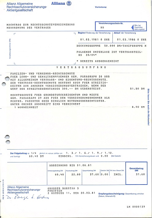 Beispiel für eine Versicherungspolice. Sie wurde mit Laserdruck erstellt und konnte mit Tipp-Ex anonymisiert werden. Zu Löschen waren die Adresse und die Versicherungsnummer.