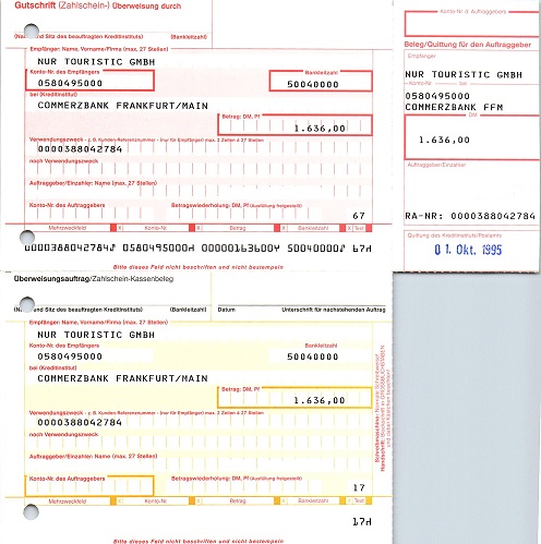 Hier reicht Schwärzen alleine nicht aus, da der Nadeldruck auf dem Blatt Vertiefungen hinterlässt. Hier muss zuerst mit Tipp-Ex die Vertiefung aufgefüllt werden. Wenn dies ausreicht, wird nichts weiter gemacht. Bei vielen Belegen scheint aber der Nadeldruck aber auf der Rückseite durch. Hier reicht meist aber, mit einem schwarzen Edding den Bereich auszuschwärzen.