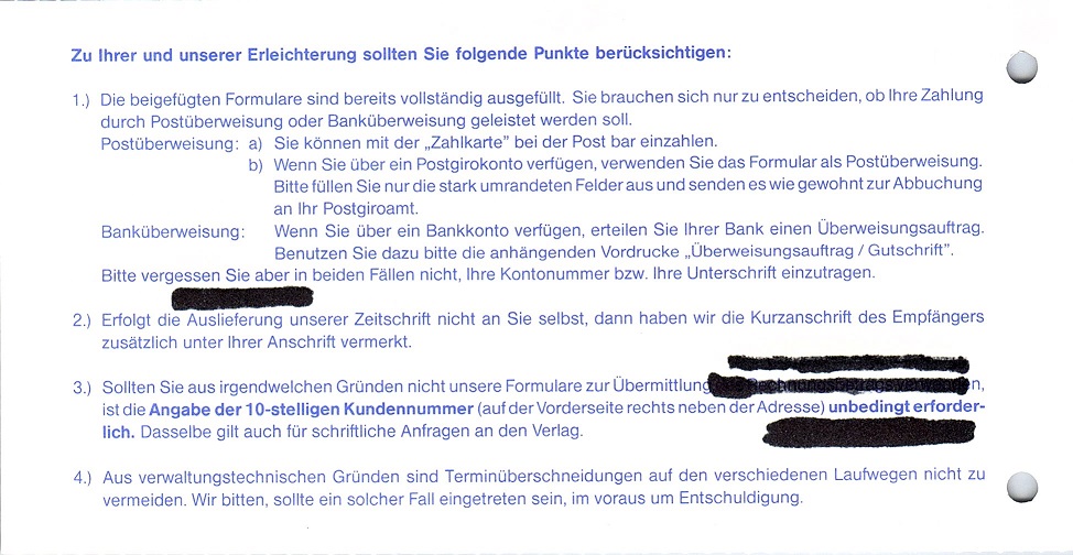 Abonnementrechnung aus dem Jahr 1986. Neben der Adresse ist hier die Kundennummer zu entfernen.