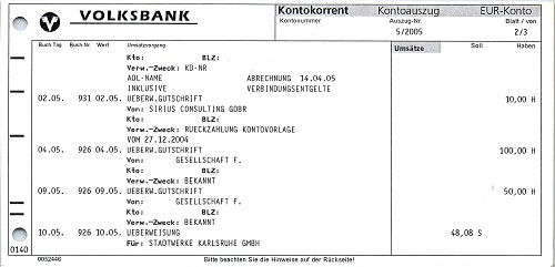 Auch Kontoauszüge befinden sich in unseren Beständen. Hier wird auch alles entfernt, was zu den personenbezogenen Daten zählt. Kontoauszüge sind mitunter sehr aufwändig, da sich hier viele Kontonummern und Namen befinden. Ausnahmen bilden Kontoauszüge vor ca. 1994. Davor wurden noch nicht so viel an Daten abgebildet. Kontoauszüge vor etwa 1985 beinhalten kaum Daten, die gelöscht werden müssen.